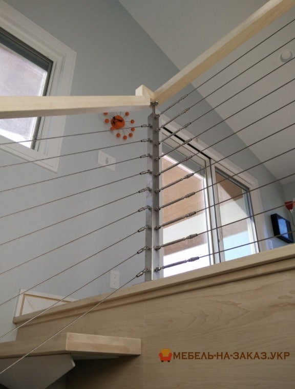 Ограждения в виде струн выглядят очень современно и в то же время сочетаются с классическим стилем, когда лестница изготавливается из металла и натурального дерева. Струны могут быть разной толщины и установлены с различной частотой. Их устанавливают как горизонтально, так и вертикально. Струны крепятся как к деревянным, так и к стальным опорным стойкам ограждений.
