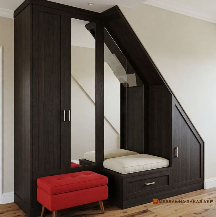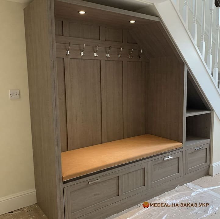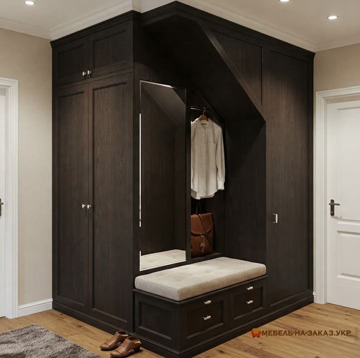 Для средних и маленьких помещений выбирают угловые прихожие. В индивидуальном порядке изготавливают шкафы ýже, выше. Реально выбрать полнофункциональные составляющие: банкетку, совмещённую с мини-тумбой, внутри которой есть место для специальных кремов, пропиток, ложечек.