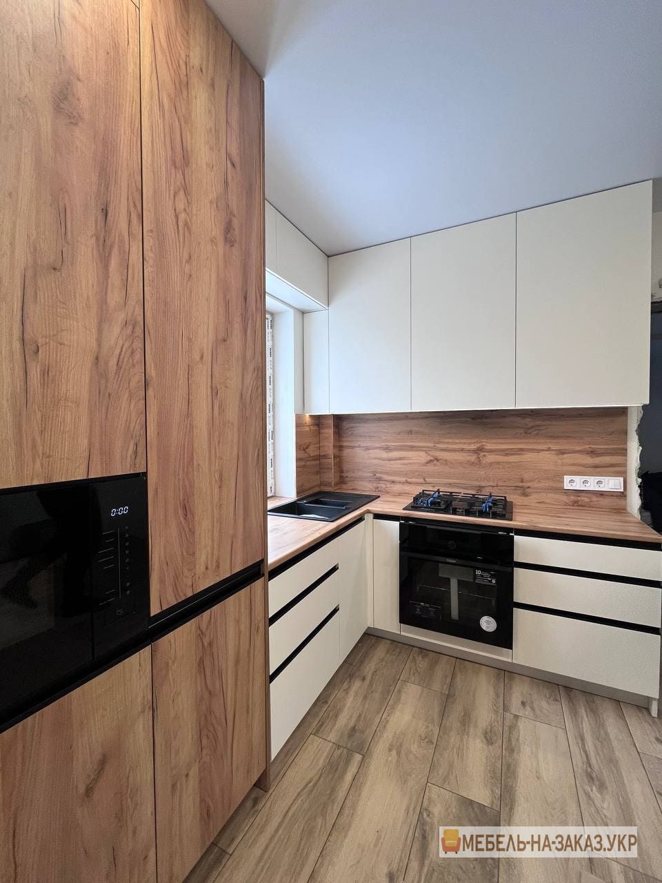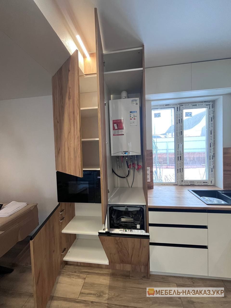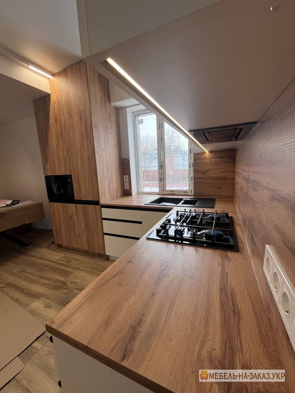 - Нестандартні приміщення потребують нестандартних підходів до організації інтер’єру. Кухня виготовлена на замовлення оптимально впишеться навіть у незвичайне планування, при цьому максимально використовується корисний простір.